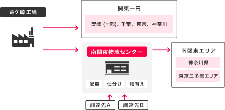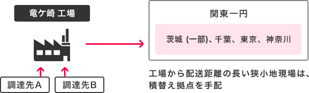 - 神奈川県に新規物流センターを構築し、当該物流センターを中継して南関東エリア向けの現場配送を実施することで、トータル走行距離を削減。