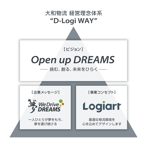 私たち大和物流は、全てのステークホルダーと生きる歓びを分かち合い、ともに成長する真のパートナー企業として、社会の進歩に貢献し、夢ある未来を切りひらく企業を目指します。