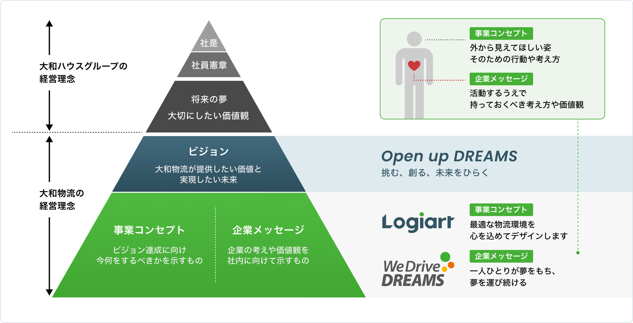 D-Logi WAYは、当社の3つの経営理念(ビジョン、事業コンセプト、企業メッセージ)を体系化したものです。会社および従業員が共通して持つ行動指針や価値観として位置づけています。