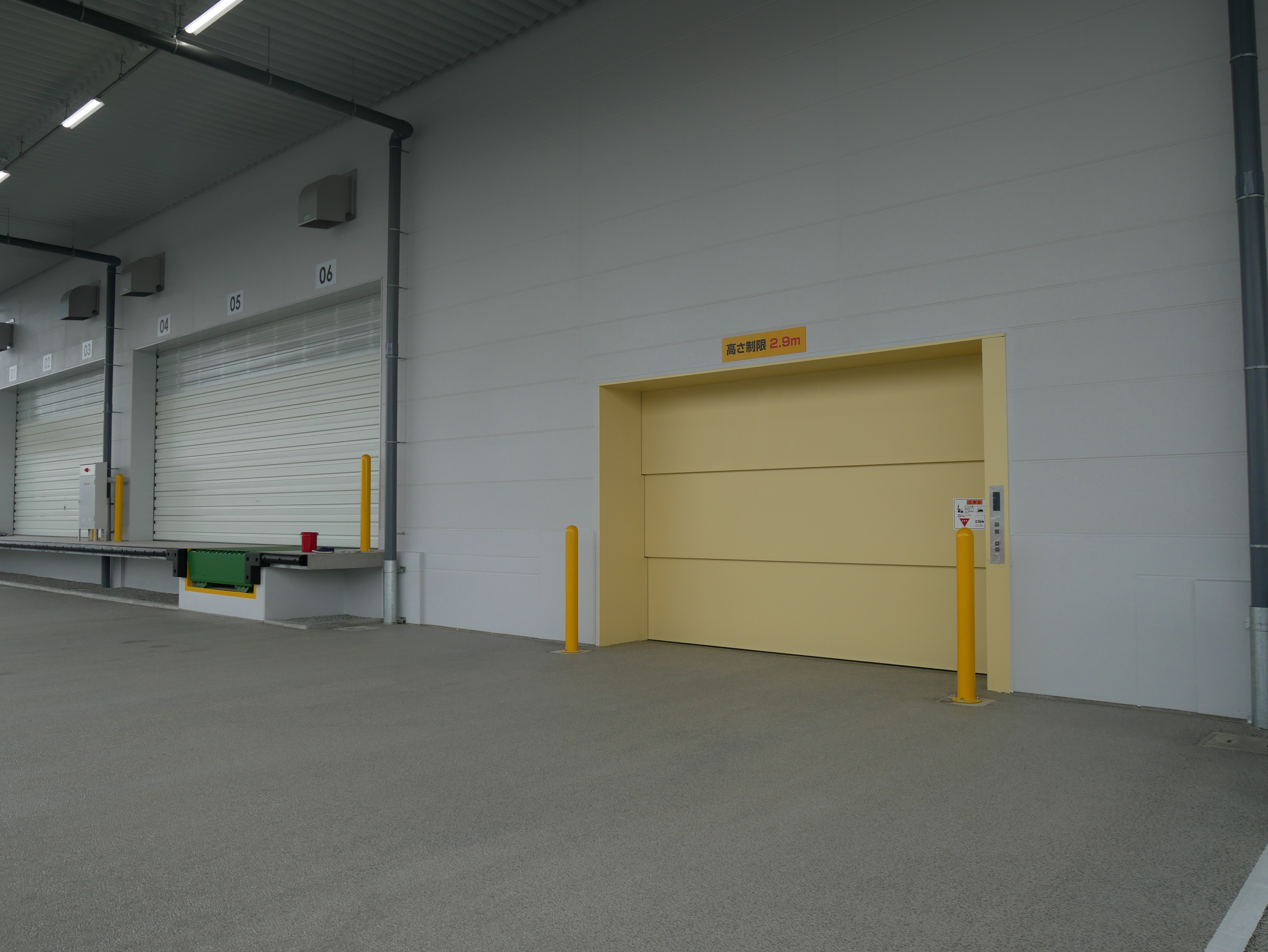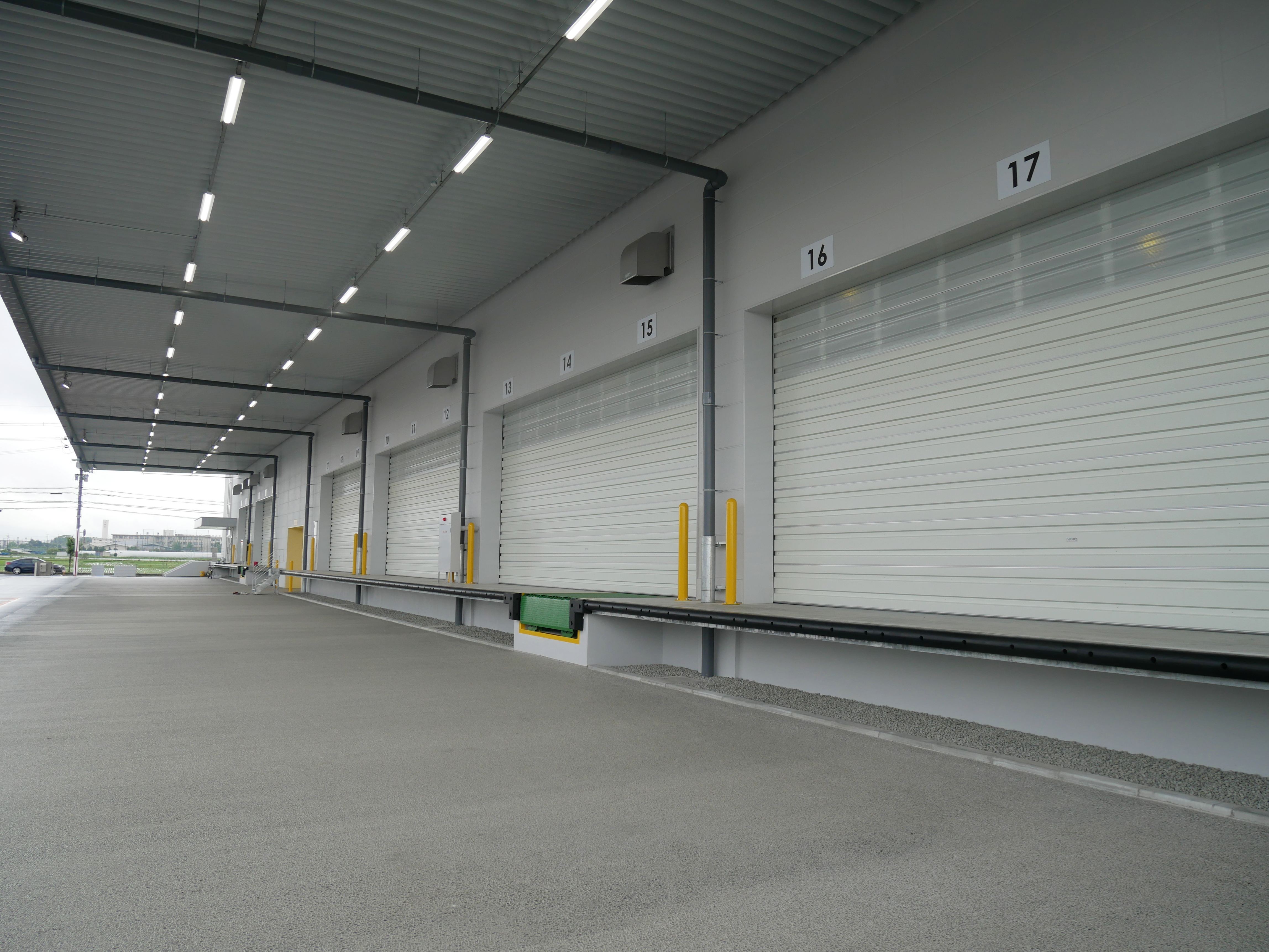 「久御山物流センター」では、ロールボックスパレット(かご台車)や海上コンテナなどの取扱いにも適した、21台同時接車可能(4t車基準)な高床式トラックバースを設けました。 また、奥行き10mの庇によって雨天時でも貨物の積卸しが可能なほか、建物の搬入口とトラックの荷台との高低差を無くす装置「ドックレベラ―」を設置しました。あわせて、トラックバース直結の貨物用エレベータも備えており、効率的な荷役業務が可能です。 さらに、倉庫及び事務所の全館でLED照明を採用し、屋上には太陽光パネル(約500kW)を敷設するなど、環境にも配慮した施設です。