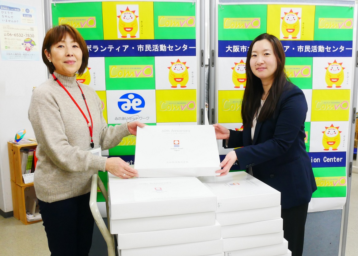 お客さまやお取引様、従業員に配布した60周年記念ノベルティのストック分を大阪市福祉協議会の「こども支援ネットワーク事業」に寄付しました。提供した物資は、市内の子ども支援団体に給付が行われました。