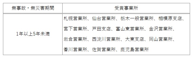 10月1日を基準日として、全所員が、1年間以上無事故(事業用車両及び業務用車両による交通事故)・無災害(労働災害)を継続している事業所を、安全事業所として表彰