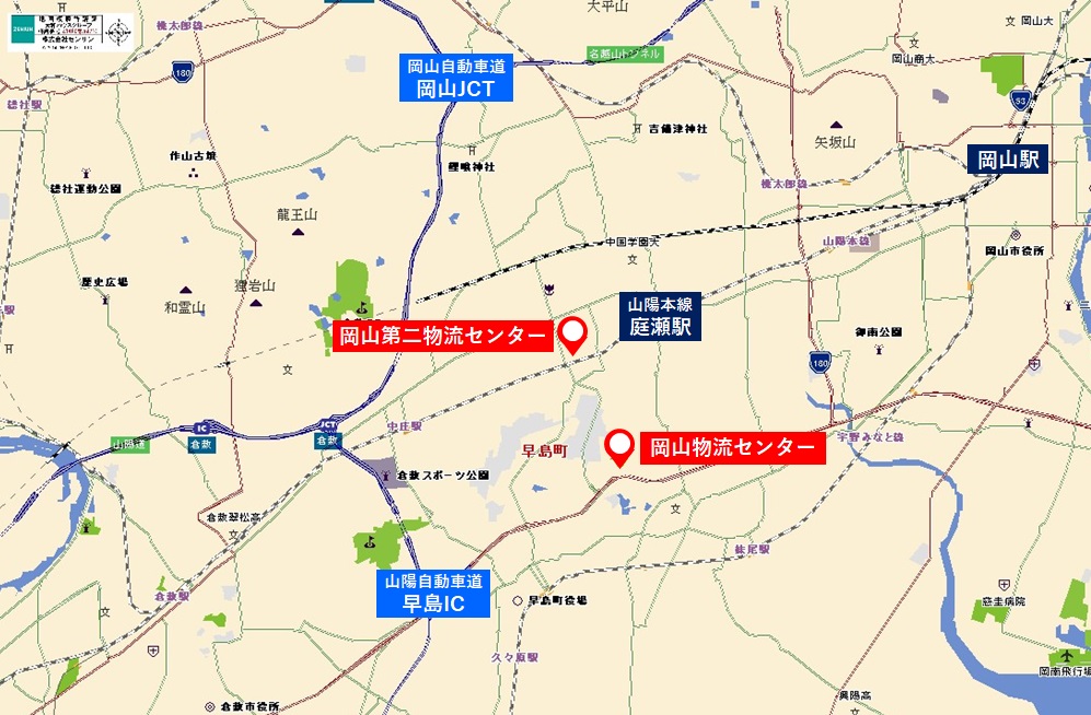 本センターから約3kmの距離にある岡山物流センター(約2,000坪)との連携により、繁閑による在庫量の増減への対 応や、車両や人員の連携による安定的な施設運営を展開します。