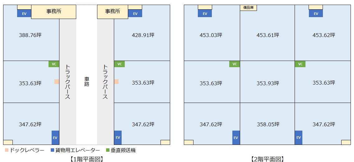本センターは、全フロア床荷重2.0t/㎡、梁下有効天井高5.5m以上、柱間隔10m以上を確保します。また、倉庫内には貨物用エレベーター4基と垂直搬送機2基を設置するため、効率的に貨物を搬送することが可能です。