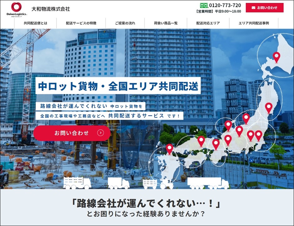 当社は、かねてより大和ハウスグループの物流会社として現場配送を強みとした建築・建材物流に取り組んでまいりましたが、近年、中ロット貨物の輸配送に関するご相談を多くいただくようになってきたことから、2020年7月から、建材や設備機器などの貨物を対象とした共同配送サービスを提供しています。