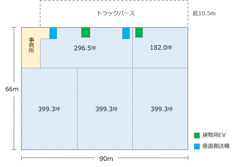 また、トラックバース直結の貨物用エレベーターと垂直搬送機をそれぞれ2基設置するため、効率的な荷役業務が可能です。
