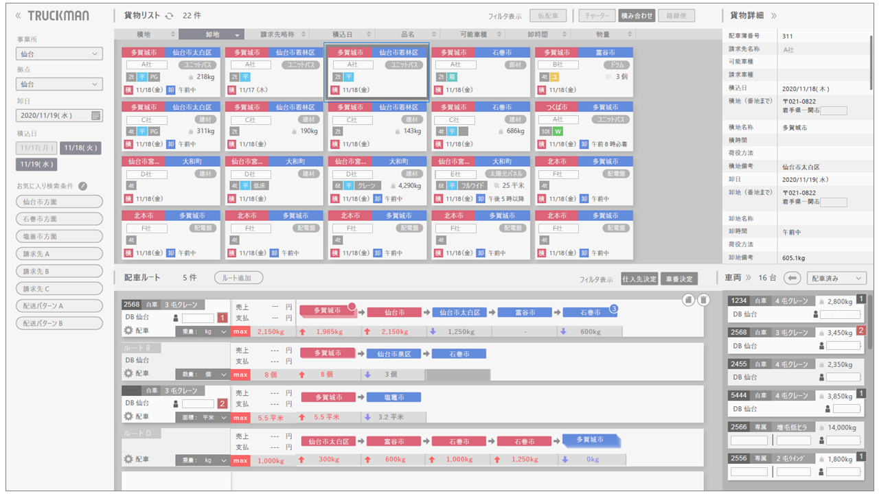 配車業務は、複数の集荷先・納品先に立ち寄り、積込み・荷卸しをする場合、積載可能重量や走行距離、指定時刻やドライバーの勤務可能時間などすべての段取りを整える必要があり、配車担当者の技量が重要となる一方で、熟練スタッフの属人的な業務となりやすく、業務の標準化やノウハウの共有が難しいという問題があります。