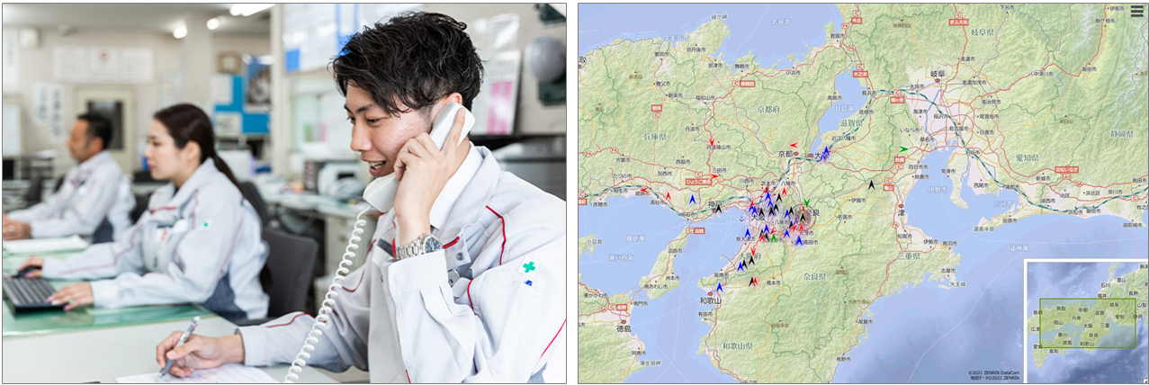 オンライン・GPS機能搭載の「動態管理システム」の導入によって車両の位置や運行状態をリアルタイムに把握し「見える化」することで、道路の渋滞度に応じた配送指示を実現。さらに、到着時間の予測精度向上により、集荷地点等で発生する待機・荷待ちの低減に繋げます。