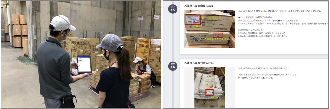 入出庫、在庫管理、流通加工といった物流センター業務は、製品特性や荷扱物量、荷主業界の商慣習などでバラつきが大きく、各現場での業務フローの構築と品質維持が求められます。 クラウド型の「マニュアル作成・共有システム」を導入することで、写真や動画を使って誰でも簡単にビジュアルベースのわかりやすい作業手順書を作成することができ、作成や更新にかかる管理者の負担が軽減されると同時に、作業者自身がいつでも手順書にアクセスできるため、人材の早期戦力化を実現します。