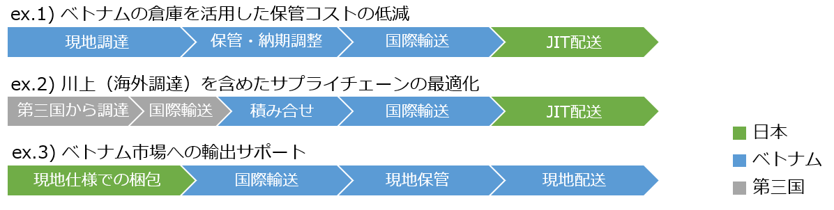 ダイワロジスティクスベトナムでは、利用運送事業※3や倉庫事業※4などの事業ライセンスのもと、これまで当社が日本国内で建築・建材物流のエキスパートとして培った3PL事業のノウハウを生かし、ベトナム国内での保管から、輸出先に合わせた流通加工、輸配送の手配まで、日本品質の物流サービスを提供します。現地の物流企業とパートナーシップを締結することで、日系・非日系の製造業や商社、流通業などの幅広いお客さまに対し、日本との国際一貫輸送やベトナム国内での現地3PL、周辺国との三国間輸送など、ご要望に沿った国際物流ソリューションを提案していきます。