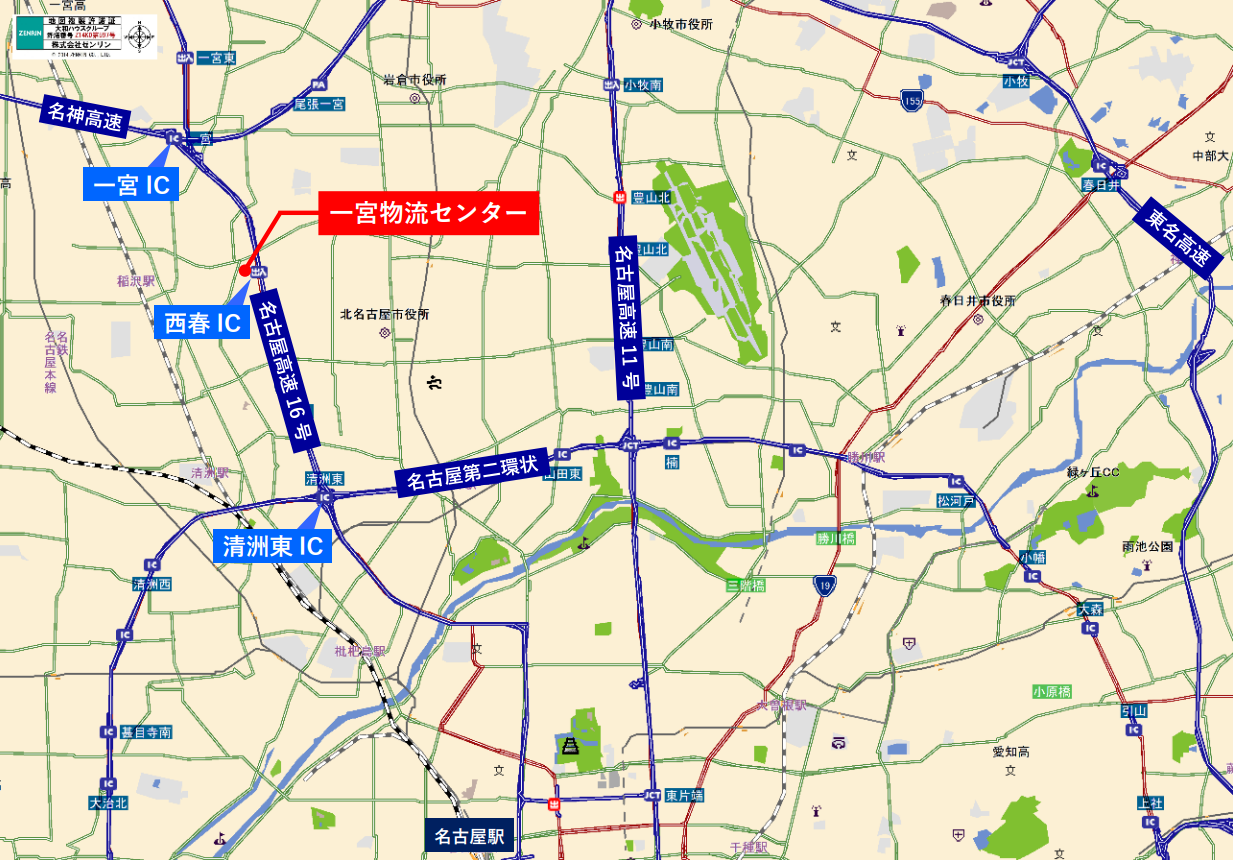 本センターは、名古屋高速16号一宮線「西春インターチェンジ」から約1.5km、名古屋第二環状自動車道「清洲東インターチェンジ」から約4kmに位置し、名古屋市内へも30分圏内と、配送拠点として最適な立地です。