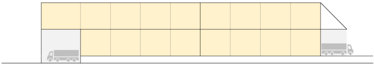本センターは、建物の2面にトラックバース※1を設置しています。北側は高床式、南側は低床式のハイブリッドバースとなっていることから、さまざまな荷役方法に合わせてトラックバース※1を使い分けることができ、効率的な入出庫作業が可能です。