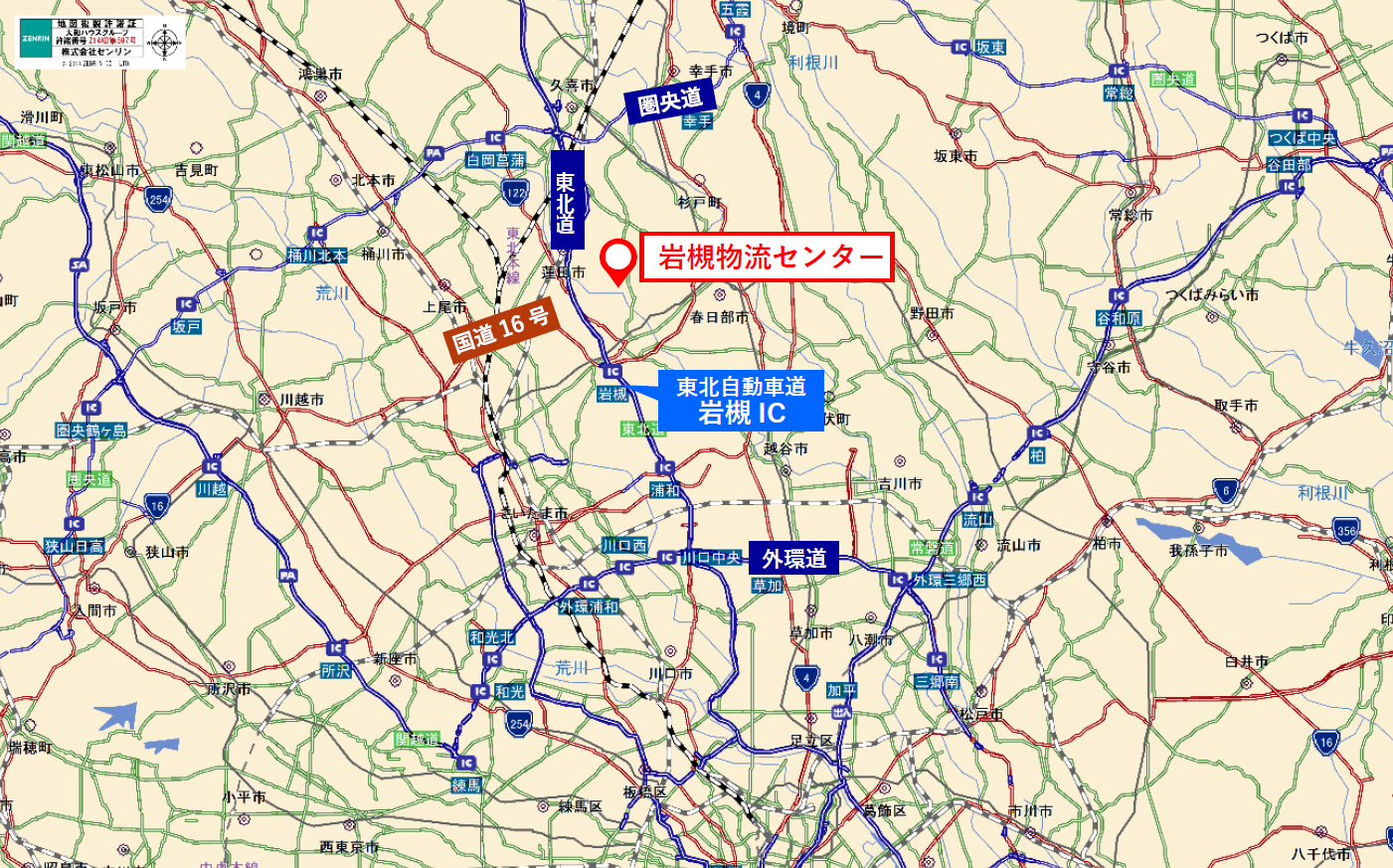 本センターは、首都圏のみならず北関東エリアへの輸配送に適した内陸部に立地します。東北自動車道「岩槻インターチェンジ」から約6.8kmに位置し、圏央道や東京外環自動車道などにより、東京都23区内や神奈川県横浜市、千葉県千葉市まで1.5時間以内でアクセスが可能です。