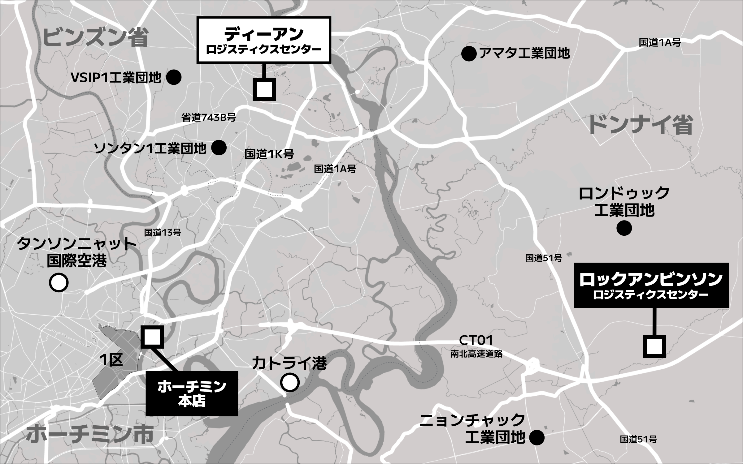 本センターは、工業団地が集積し、日系を含む多数の外資系企業が進出するビンズン省ディーアン市に所在します。ベトナム南部の主要貿易港「カトライ港」まで約30km、主要空港「タンソンニャット国際空港」まで約20kmの距離にあるため、空輸や海運による国際物流に適した立地です。