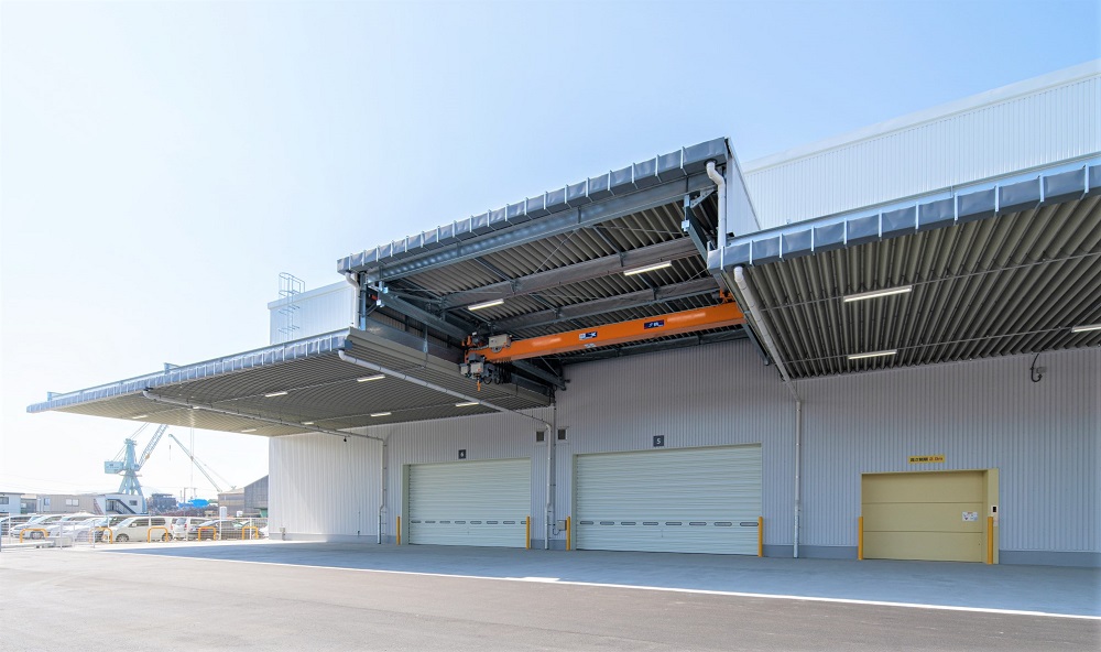 本センターは、北側をカゴ台車などの入出庫作業に適した高床式、東側を重量物の保管・荷役にも対応できる低床式とした、ハイブリッド式バース※3を採用しているため、建材・産業機器といった重量物から、細かな流通加工や衛生管理をともなう消費財まで、さまざまな貨物の取り扱いが可能です。また、天井クレーンを設置しているため、大型製品や長尺物、異形物などの入出荷にも対応します。