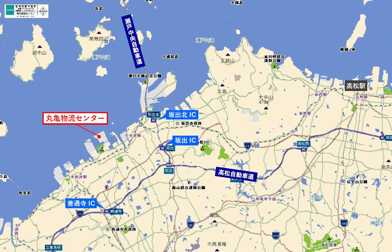 本センターは、瀬戸中央自動車道「坂出北インターチェンジ」から約8.6km、「坂出インターチェンジ」から約8.8km、高松自動車道「善通寺インターチェンジ」から約8.4kmに位置し、四国エリア全域に車で3時間30分以内にアクセスできる広域配送拠点として最適な場所に位置します。