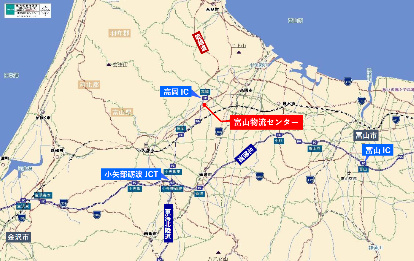 本センターは、能越自動車道「高岡インターチェンジ」から約1.3kmに位置しており、北陸自動車道を経由することで、富山市や金沢市、福井市への配送拠点などとして活用できます。また、北陸自動車道と東海北陸自動車道の結節点となる「小矢部砺波ジャンクション」まで約15km(車で約15分)圏内のため、中京圏や近畿圏への広域輸送にも優れた立地です。