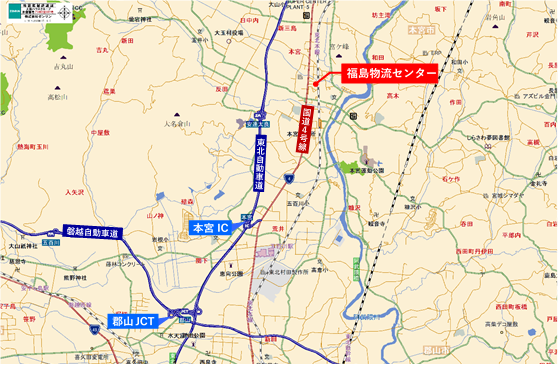 本センターは、東北自動車道「本宮インターチェンジ」から約 5.2km とアクセスに優れ、東北自動車道と磐越自動車道が交わる「郡山ジャンクション」にも約 8.0km と近接することから、物流拠点として好立地にあります。「本宮インターチェンジ」から宮城県仙台市まで約 110km、東京都新宿区まで約 250km の距離に位置するため、東北エリアと首都圏を結ぶ長距離輸送の中継拠点としても優れています※2。