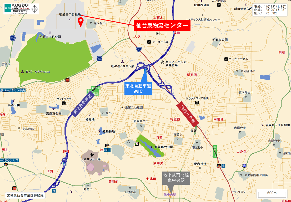 本センターは東北自動車道「泉インターチェンジ」から車で約10分(約4km)、「仙台駅」から約35分(約10km)、「仙台港」から約30分(約20km)の場所に立地しているため、仙台市街地への近距離配送や東北地方の広域輸送のハブ拠点として適しています。