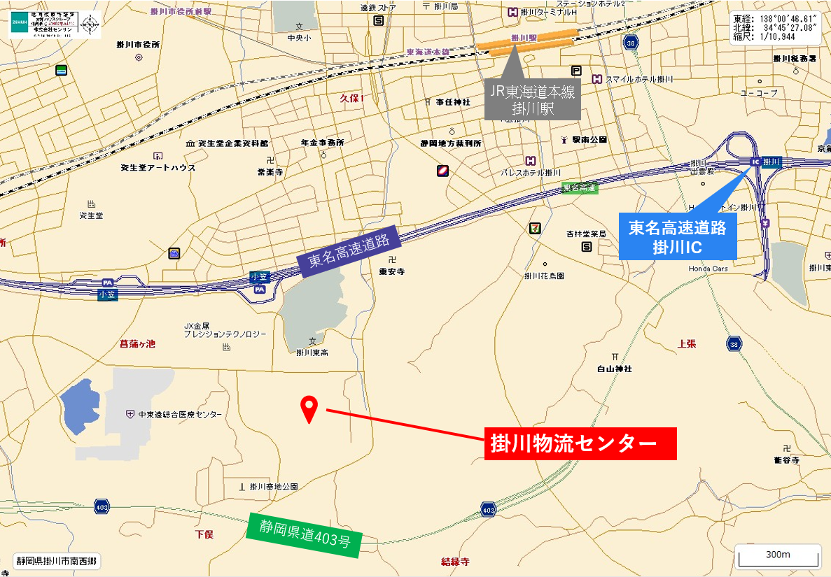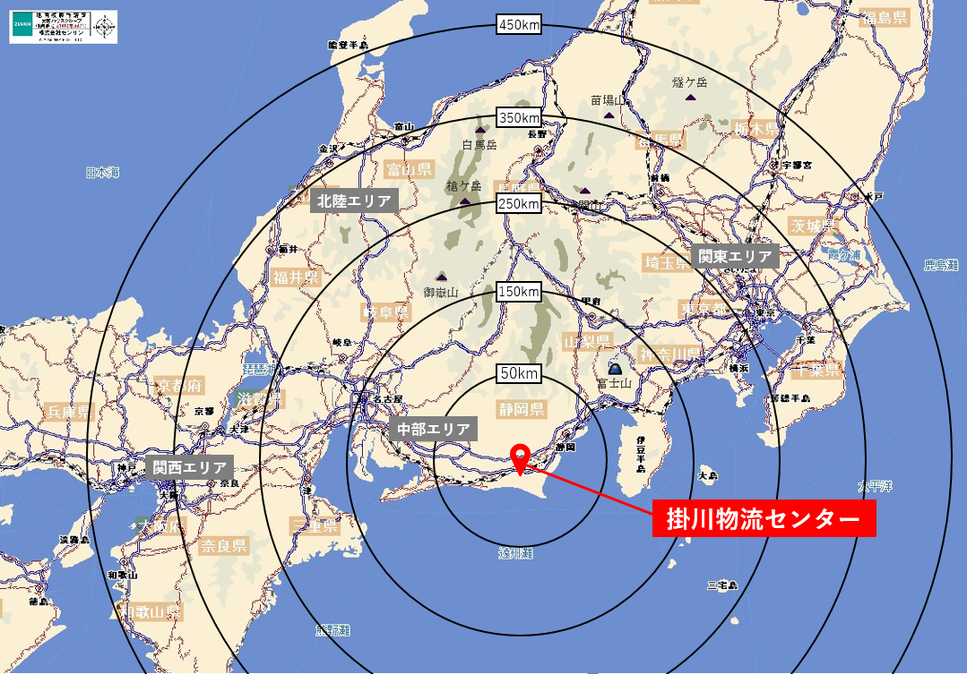 本センターは、東名高速道路「掛川インターチェンジ」から約2.7kmに位置し、東京(霞が関インターチェンジ)から約220km、大阪(吹田インターチェンジ)からは約270kmと日帰り運行が可能な距離であるため、長距離輸送における中継拠点として適しています。