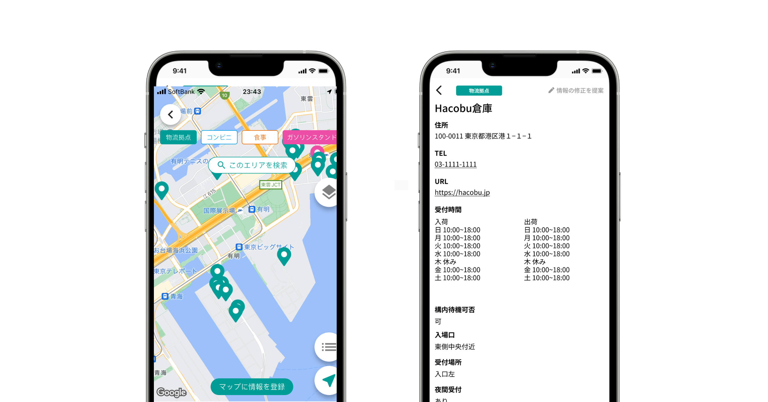 「物流情報マップ」は、全国の物流センターや大型車が駐車可能なコンビニなど、ドライバー業務に役立つ約2万地点の情報をマップ上で確認できる機能です。