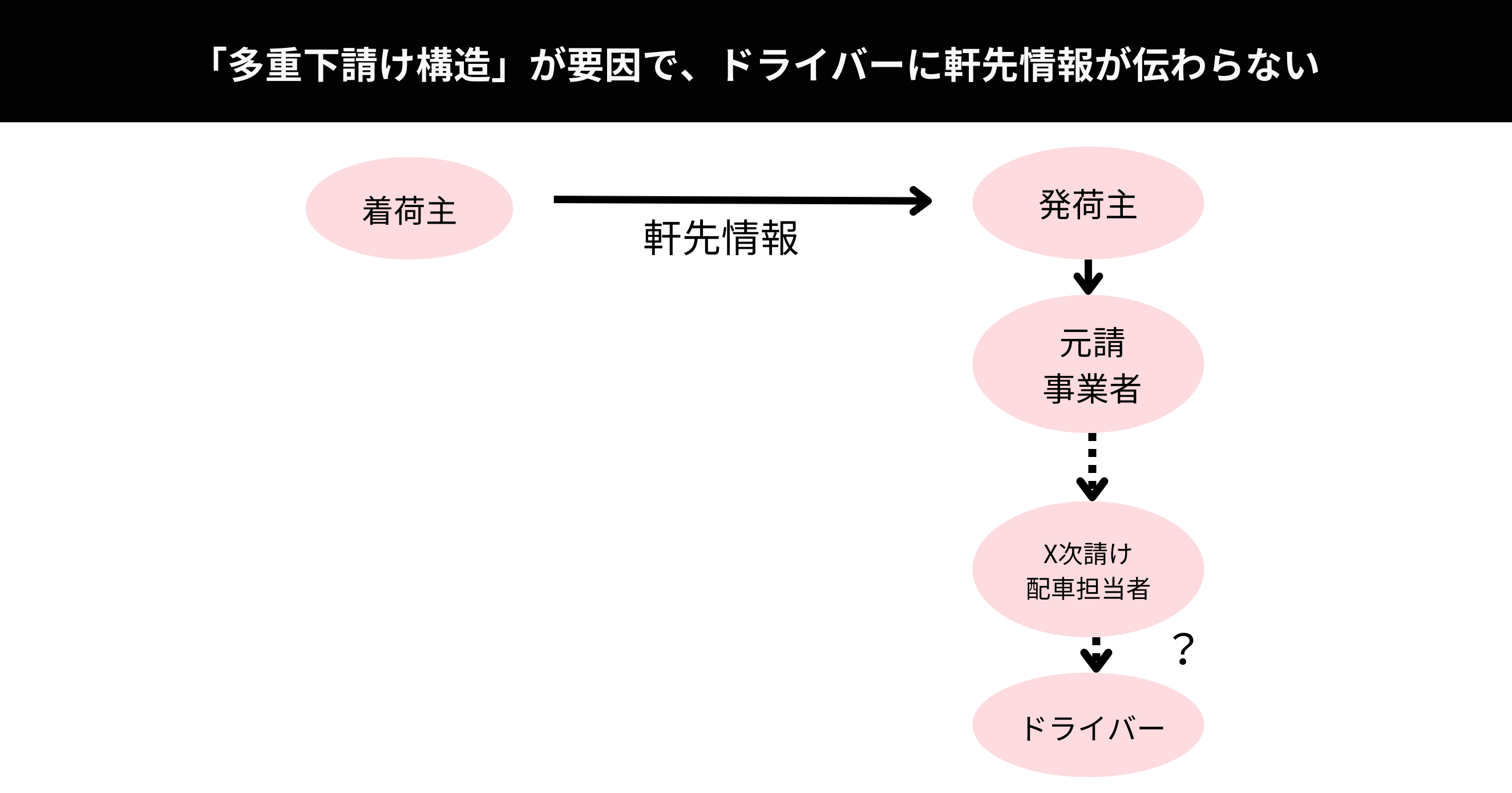 さらにトラック運送取引では、元請事業者から1次請け、2次請けの運送事業者に配送を委託する「多重下請け構造」が常態化しています。この構造の影響で、着荷主が発荷主に情報を伝えたとしても、その情報が分断され、ドライバーに軒先情報(受付時間、場所、入場口など、荷物の積み降ろしに必要な物流センターの詳細)が伝わっていないことが多々発生しています。