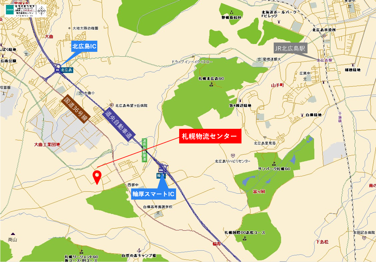 本センターは、道央自動車道「輪厚スマートインターチェンジ」から2km(車で約5分)、「北広島インターチェンジ」から3km(車で約8分)の距離に位置し、国道36号線にも近いため、札幌市をはじめとする主要都市への交通利便性に優れています。