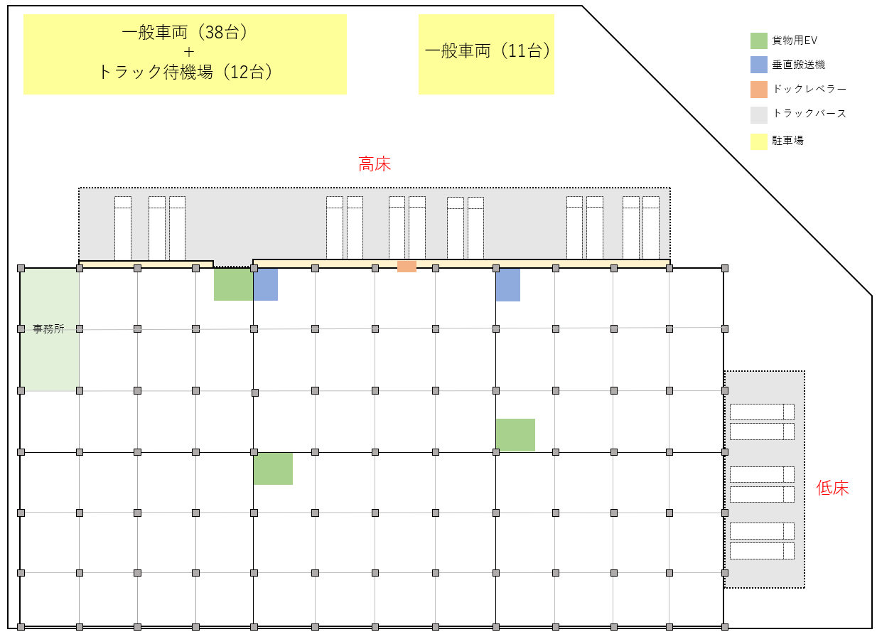 | 搬送設備 | 荷物用エレベーター 4.6t:1基、3.6t:2基 垂直搬送機 1.8t:1基、1.5t:1基 ドックレベラー:1基 |