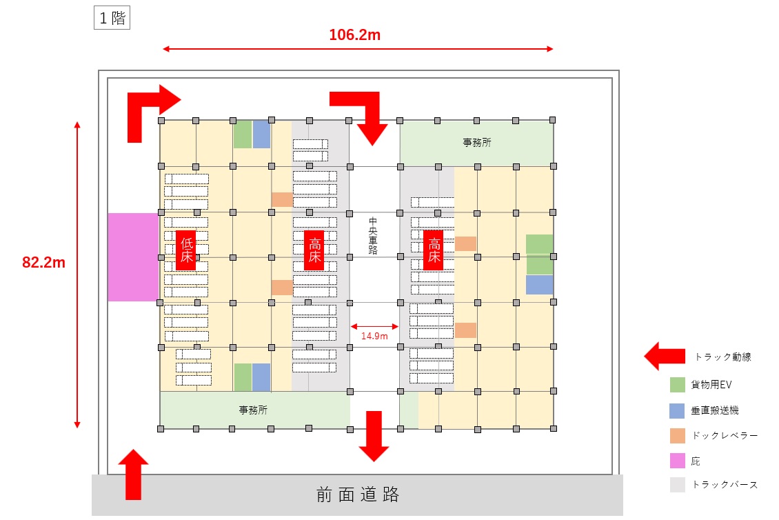 | 搬送設備 | 荷物用エレベーター 3.5t:4基 垂直搬送機 1.5t:3基 ドックレベラー 9.0t:4基 |