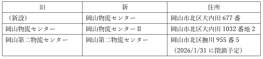 本センター開設に伴い、2025年10月1日付けで岡山県内の物流センターの機能を集約するとともに、センターの名称を下記の通り変更いたしました。