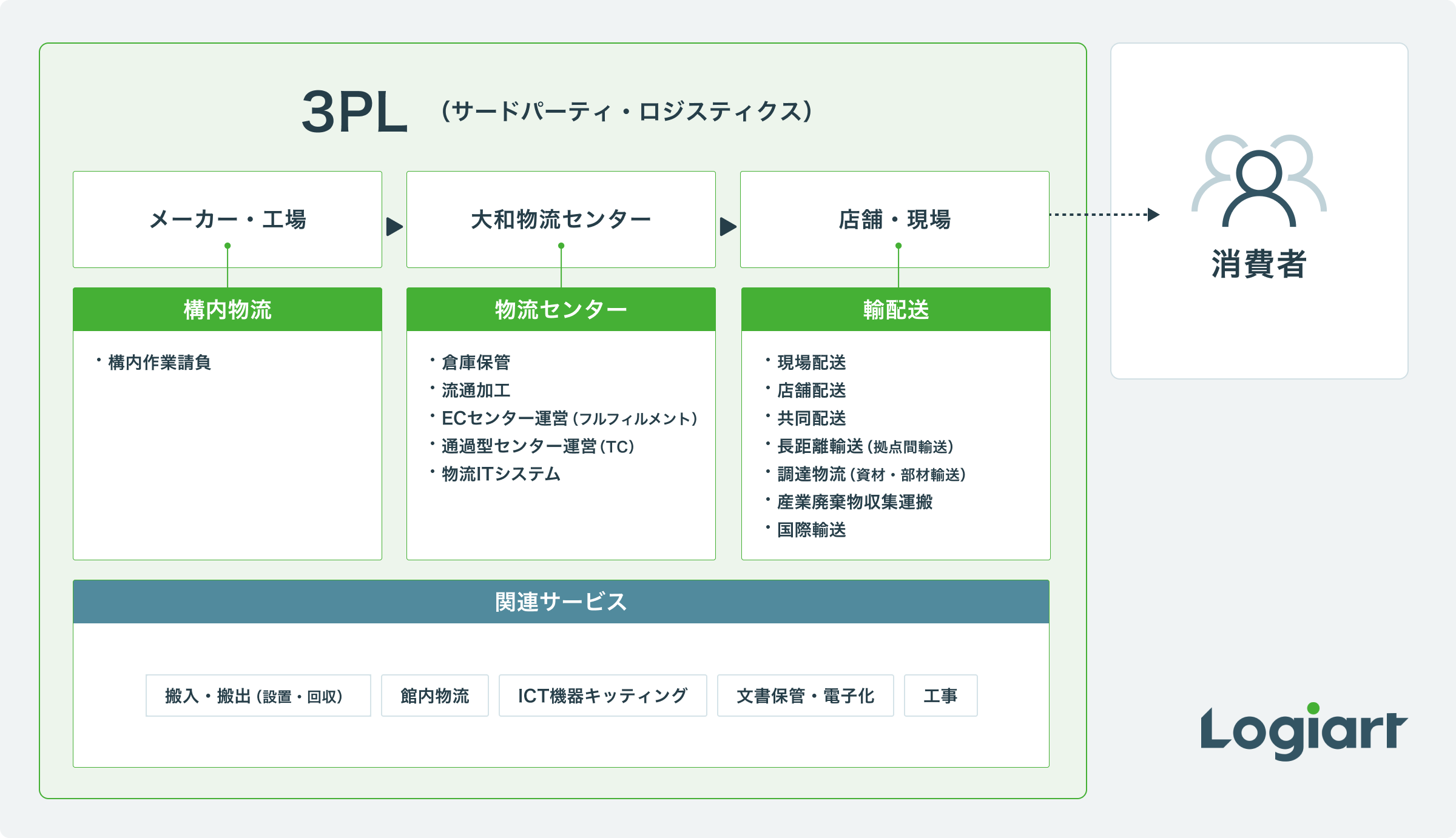 企業の物流を設計・運営する3PLや、店舗や工事現場にモノを運ぶ輸配送などのサービスを中心にお客さまの物流を支えています。
