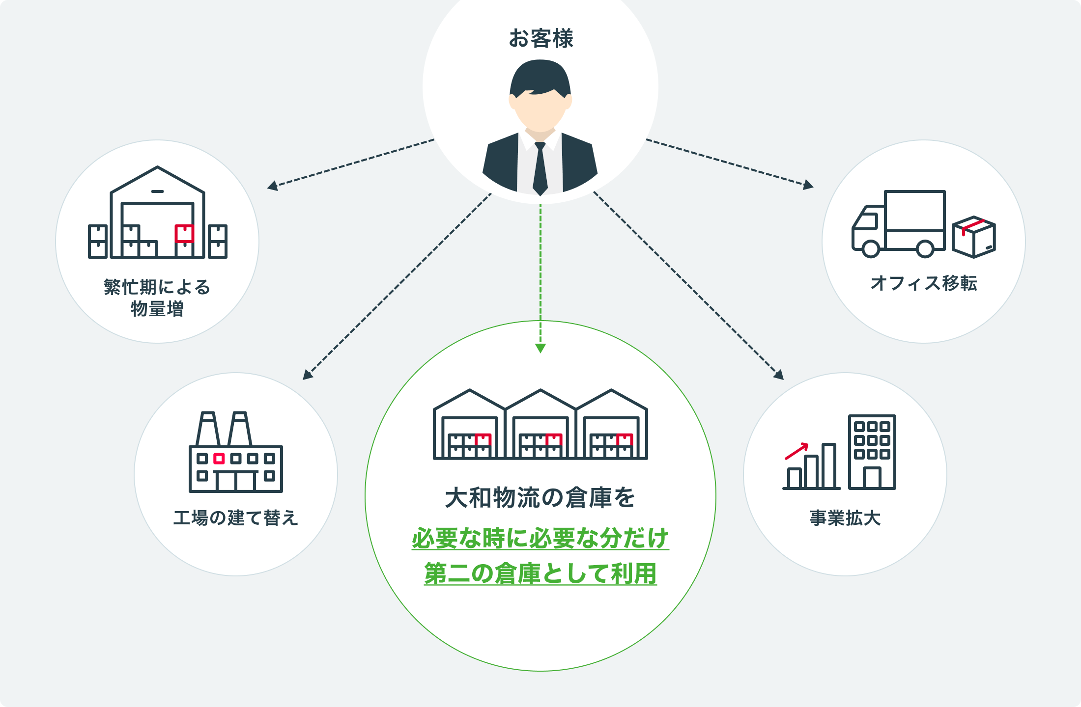 - 工場の建て替えやオフィスの移転で、短期的に資材や什器を預けたい