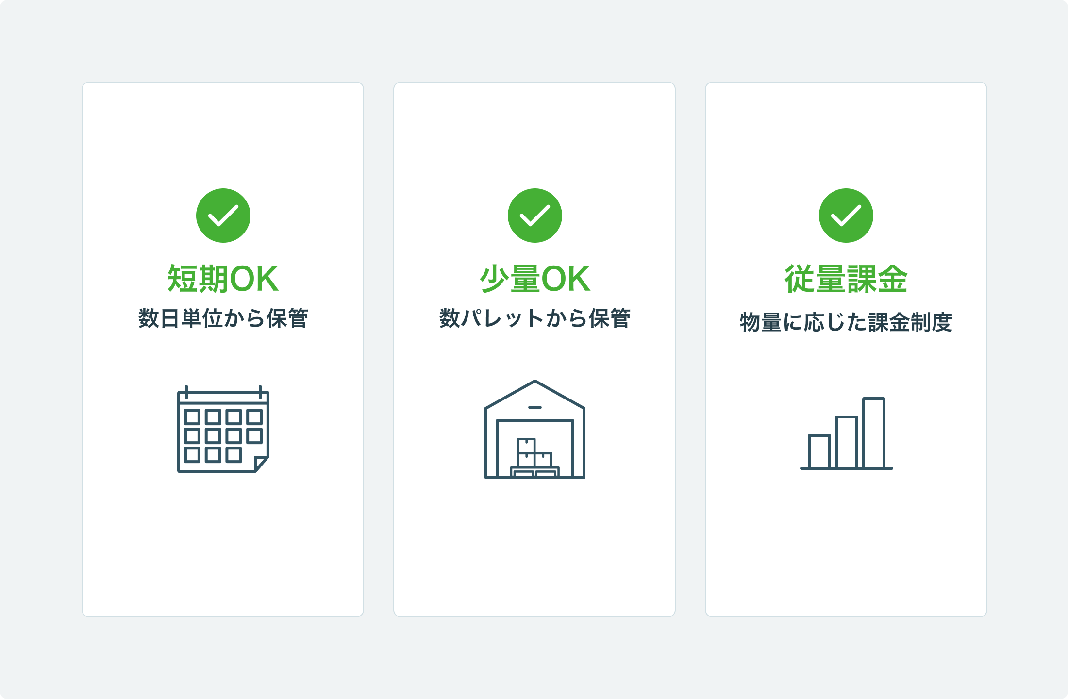- 明確な最低契約期間は設けておりません。1日単位でのスポット利用や、数パレット・数ケースといった少量貨物のお預かりも可能ですので、まずはお気軽にご相談ください。