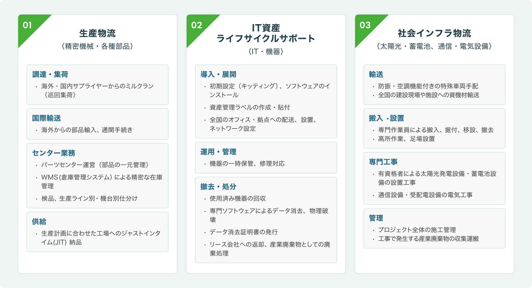 多様な大型設備・機械からICT機器、エネルギー関連資材まで、幅広い製品の物流を担ってきた実績があります。