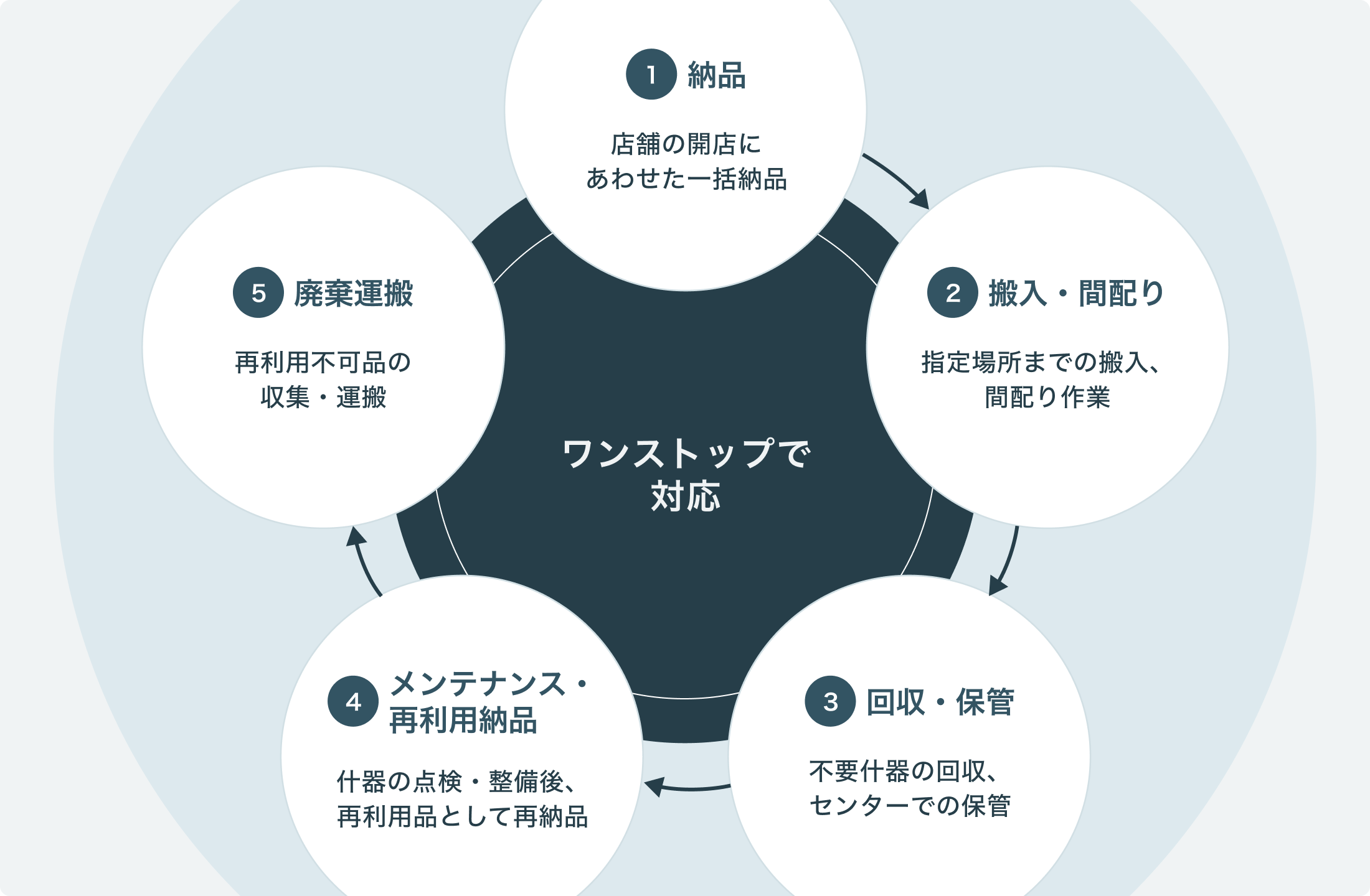 什器・備品は、店舗の開店時には複数のサプライヤーの什器・備品をまとめて一括納入したり、閉店時には不要になった什器を一斉に引き取るなど、総合的な対応が求められます。