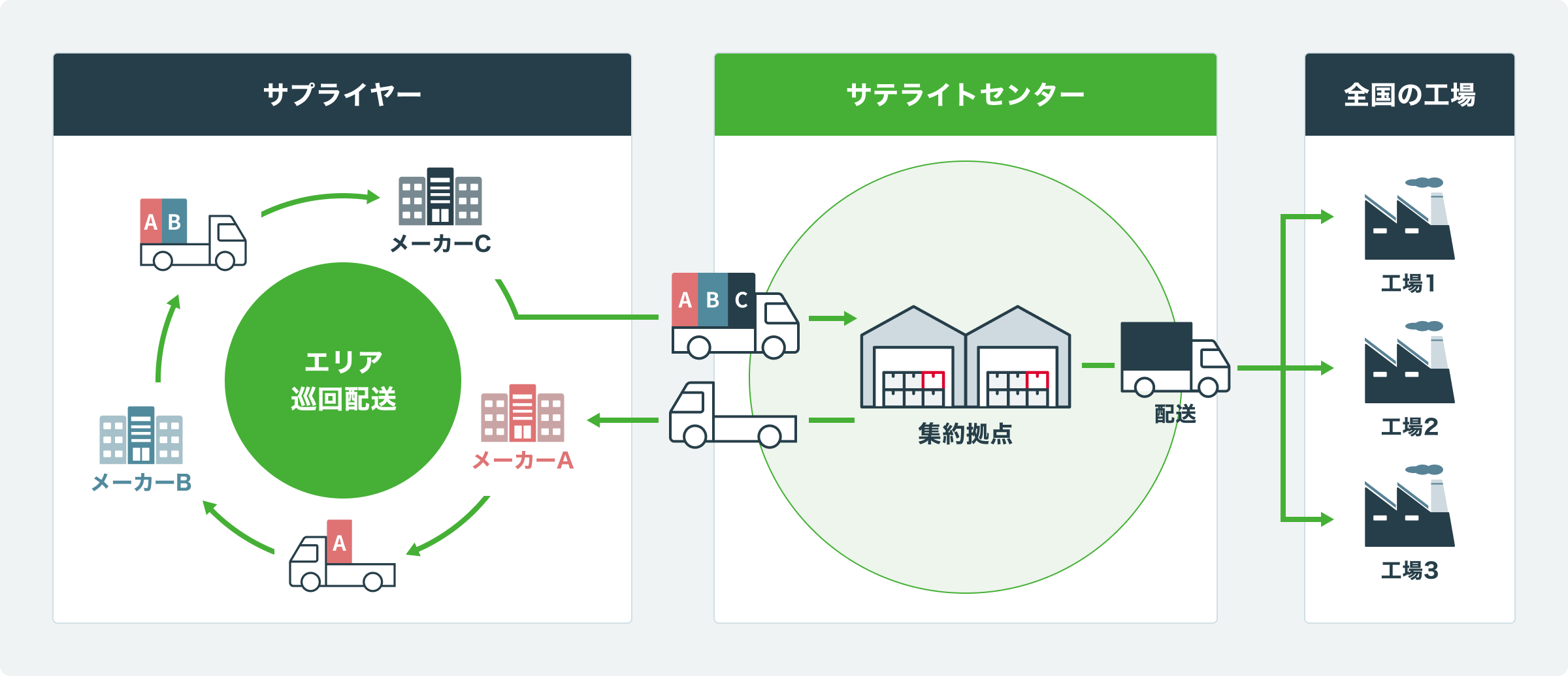 複数のサプライヤーを1台のトラックで巡回して集荷する「ミルクラン方式」により、小ロットの資材でも効率的に集約できます。各サプライヤーの出荷頻度を揃えることで、安定した納品サイクルを実現し、計画的な生産活動を支えます。さらに、製品配送を終えたトラックの帰り便を集荷に活用することで、積載効率を高めながら、CO₂排出量の削減にも貢献します。