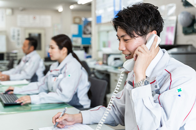 夜間・早朝時間帯における遠隔地の乗務前後点呼について、IT機器を活用した遠隔点呼を行っています。全国をカバーする点呼拠点にて、法令で定められた項目の確認・指示を実施。運行管理者の業務負荷軽減に考慮した取組みとしても推進しています。