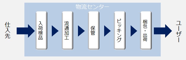 | 流通加工 | 商品を販売できる状態にするために加工(値札・タグ付け、袋詰め等)する作業です。合わせて検品を行う場合もあります。商品を小分けにしたり、見栄えを整えたりすることによって、顧客満足度を高めることが目的です。 |
