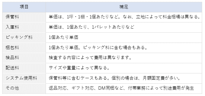 物流アウトソーシングの費用は、基本的に「保管費用+入庫費用+ピッキング費用+梱包費用+発送費用」で構成されています。その他にも「流動加工費」「棚卸費用」「返品交換費用」「システム使用料」といったオプション費用が必要となる場合もあります。費用の内訳は物流会社ごとに異なるため、見積書をしっかりと確認しましょう。