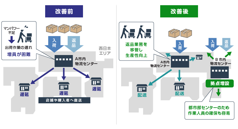 西日本の物流センターでのスタッフ増員では対応できないと判断し、翌日午前中着のサービスレベルは維持するという荷主の要望に応える形で、出荷量が多い関西エリアに新センターを開設しました。