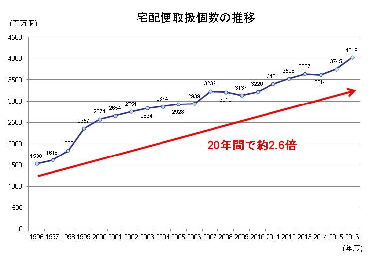 Amazonなどに代表されるEC市場の急拡大に伴って、平成28年度の宅配便の取扱件数は約40億個と、過去5年間で約5億個も増加しました(※2)。さらに、再配達による業務量の増加も重なり深刻な人手不足という状況が一気に顕在化しています。