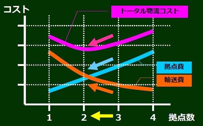 下図のように、物流センターコストと輸配送コストはトレードオフの関係にありますので、物流センターの数が増えるほど、拠点コストは増えるが配送コストは下がり、物流センターの数が減るほど、拠点コストは下がるが配送コストは上がります。