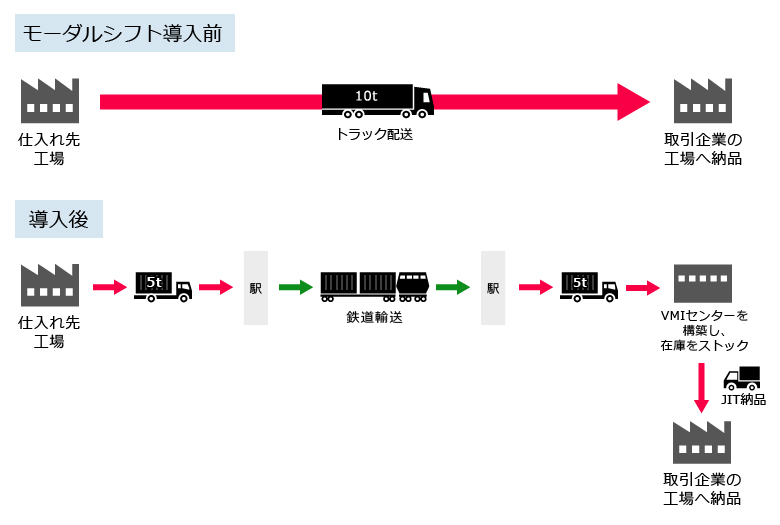 それを打破したのが、納品先工場の近隣に在庫拠点としてVMI(Vendor Management Inventory)センターを構築し、そこへ鉄道輸送で在庫を補充するという物流システムの提案でした。