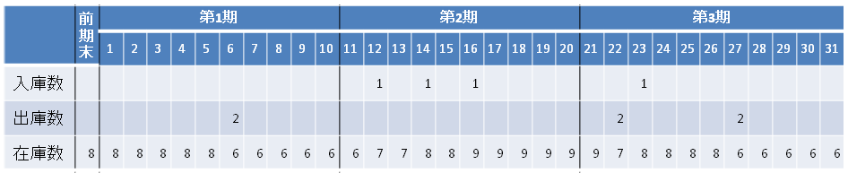 例えば第3期の場合、在庫数の最大値は9個となっていますが、3期制の料金計算における保管数は、(前期末在庫数:9)+(今期入庫数:1)の10個が正解となります。