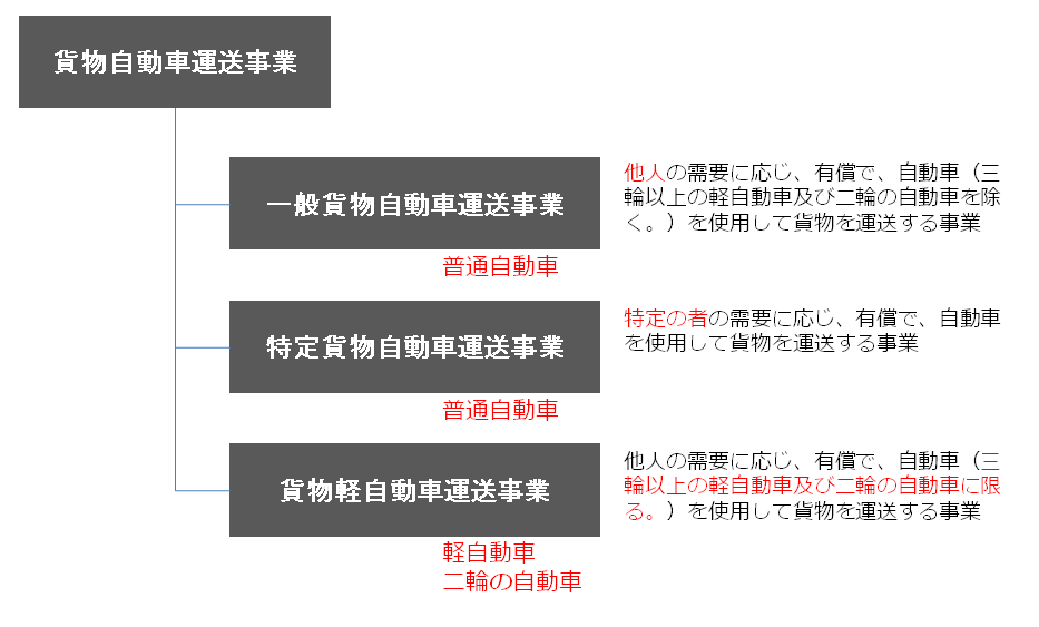貨物自動車運送事業法の定義のとおり、貨物自動車運送事業は、次の3つに分類されます。