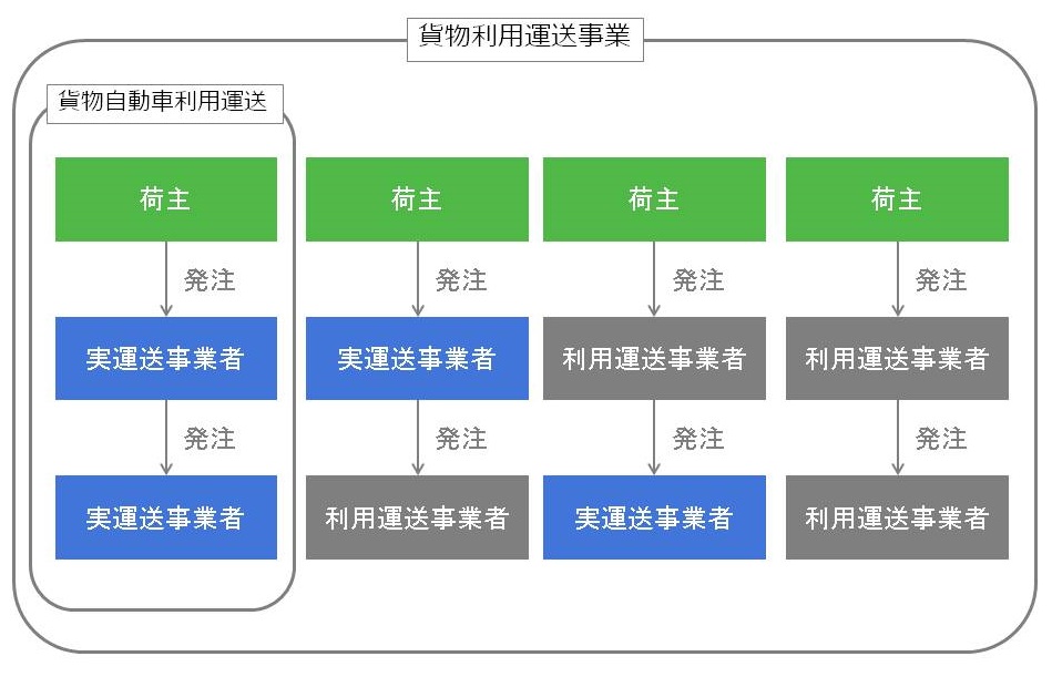 貨物自動車利用運送は、貨物自動車運送事業者(実運送事業者)が、他の実運送事業者を利用して行う運送に限って、貨物自動車運送事業法に基づく事業許可の範囲内で事業計画の許可を受けられるものです。