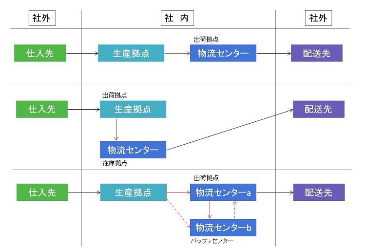 例えば、売上の拡大や繁忙期の季節波動などに伴って物量が増加し、拠点の保管キャパシティを超えて在庫拠点が増える、生産拠点には必要な流通加工機能が備わっていないため、物流センターで流通加工を行うために、物流センターへ移送するなどのケースが挙げられます。